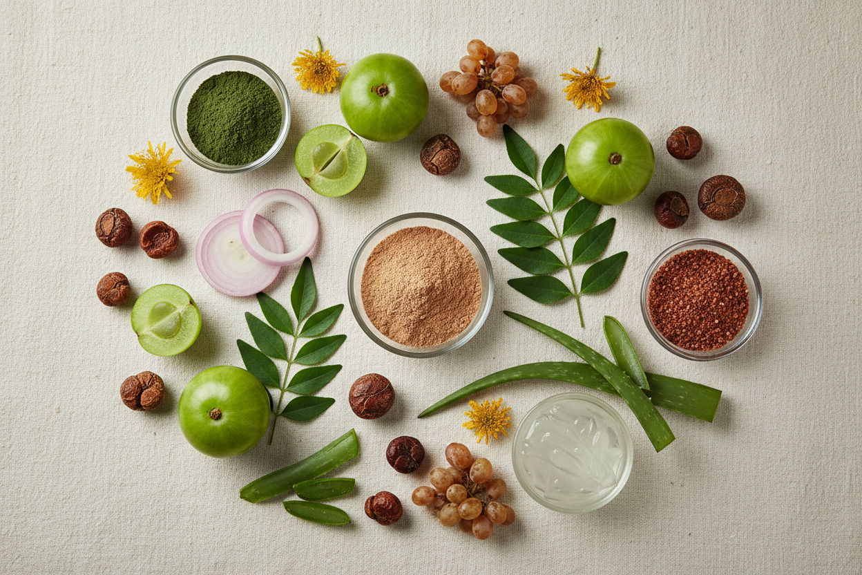 🌿 Reetha: Cleanses and maintains natural moisture.